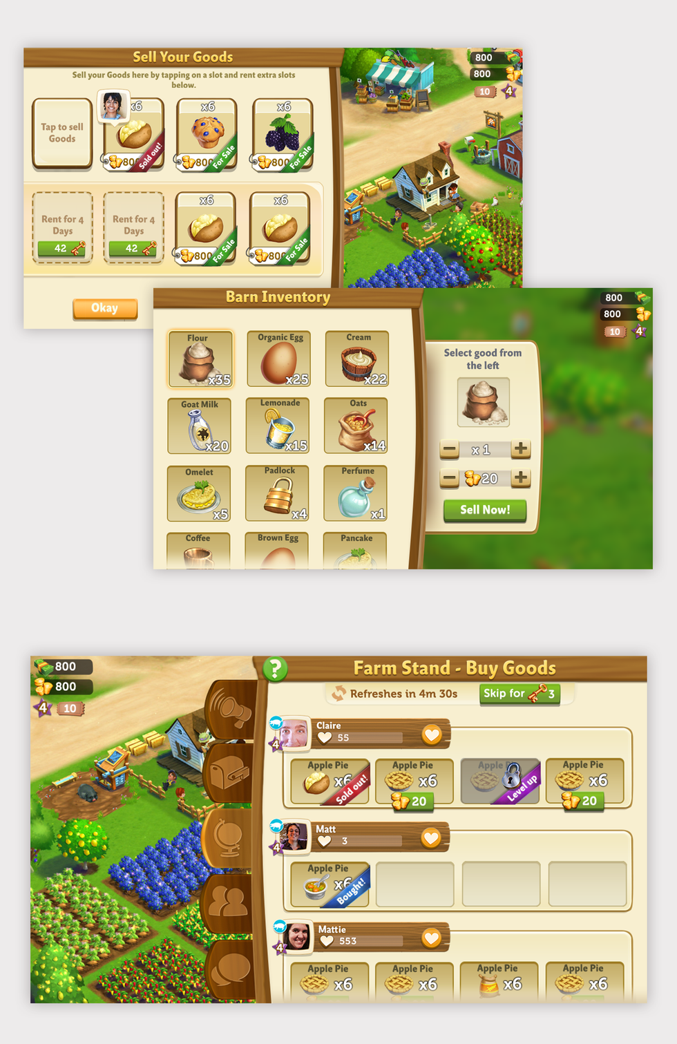 Bringing the FarmVille 2 game onto mobile wasn't a straight port over. There were key game modes that were adapted from the web version, but the team started from the ground up. The narrative did tie to the web game, but was its own separate entity. Using the web version as a baseline, the game needed to have a "Mobile First" vision. I built on the goal of creating seamless navigational models to help players build muscle memory around their game habits.